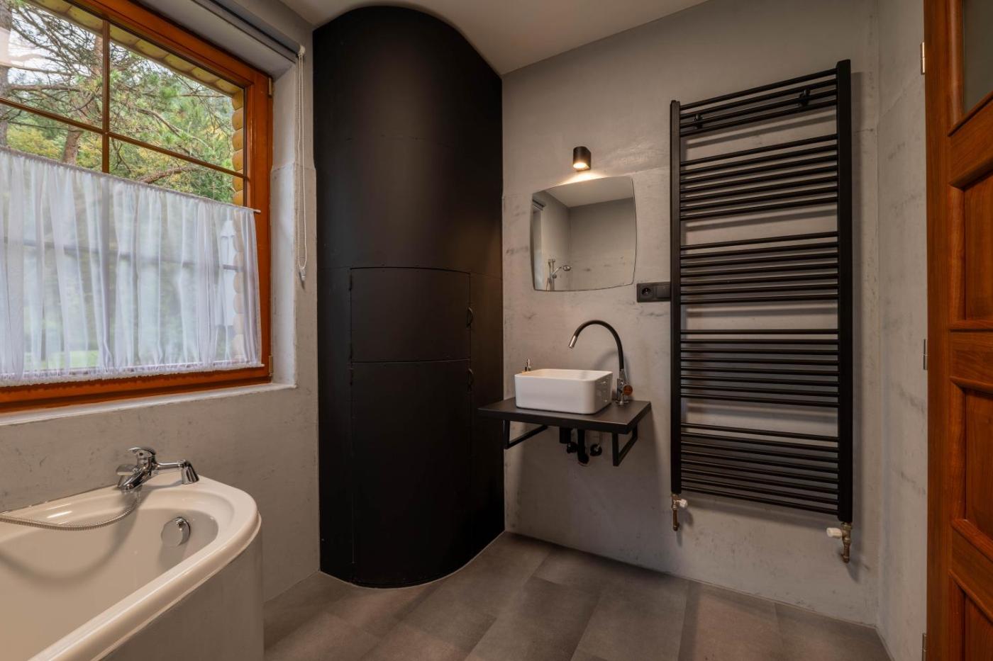 Domek z 2 sypialniami. This chalet comes with 2 bedrooms, a living room, a well-fitted kitchen with a dining area, a fireplace or a stove and a private bathroom with a shower. Domek - 5 osobowy. Powierzchnia pokoju ok.: 82 mkw. ;