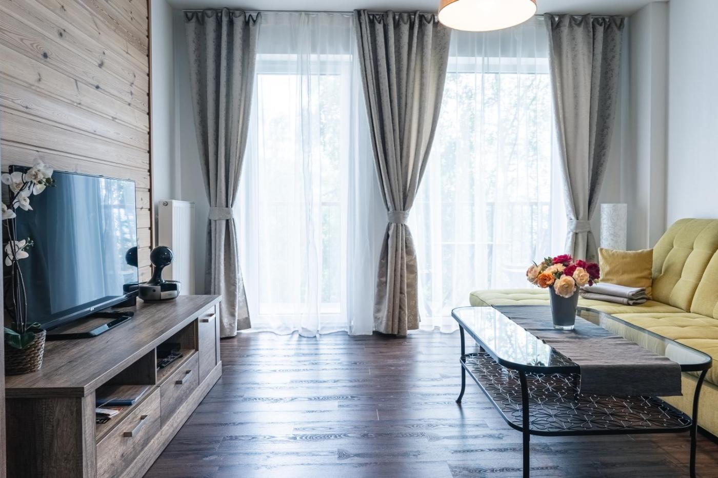 Apartament typu Superior. This apartment offers a fireplace. This apartment comprises 1 living room, 1 separate bedroom and 1 bathroom with a bath and free toiletries. Meals can be prepared in the well-fitted kitchen, which comes with a stovetop, a refrigerator, kitchenware and a microwave. The apartment provides a washing machine, a minibar, a tea and coffee maker, a flat-screen TV with cable channels, as well as garden views. The unit offers 4 beds. Apartament - 6 osobowy. Powierzchnia pokoju ok.: 59 mkw.